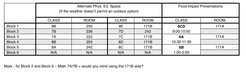 • April 8 – Tentative Food Impact Visit for grades 6 and 9